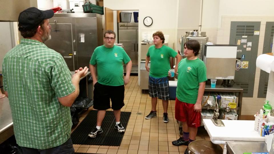 Scouts cut up 10 pounds of onions and prepped pork butts and baked beans for a feast for 275 youths visiting the church. In addition to prepping the food for cooking, head chef Bill Inman gave the scouts a tour of the kitchen, how to operate different appliances and and introduction to smoking meat including a tour of the barrel smoke and an explanation of direct and indrect heat cooking.