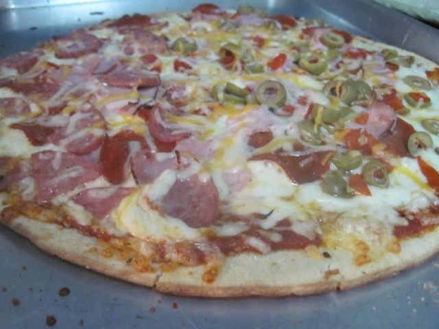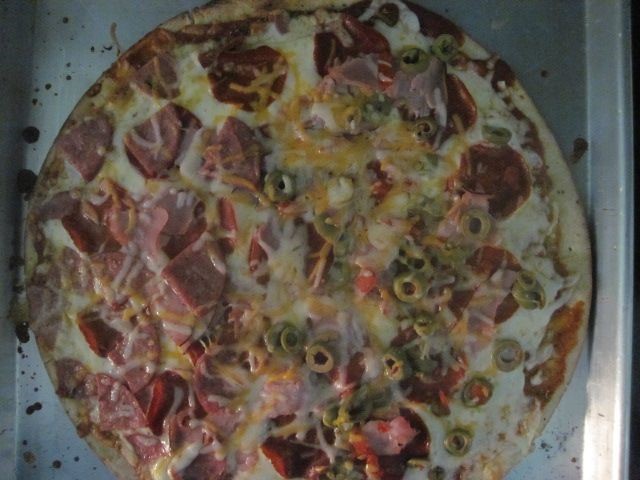 Preheat oven to 425 degrees. Spread crust on the pan. Lightly spread olive oil over the crust. Spread sauce. Spread the garlic powder around the edge of the pizza. Top with mozzarella cheese, pepperoni, ham, olives and cheddar cheese receptively. Bake 9 to 10 minutes or until crust is golden brown.